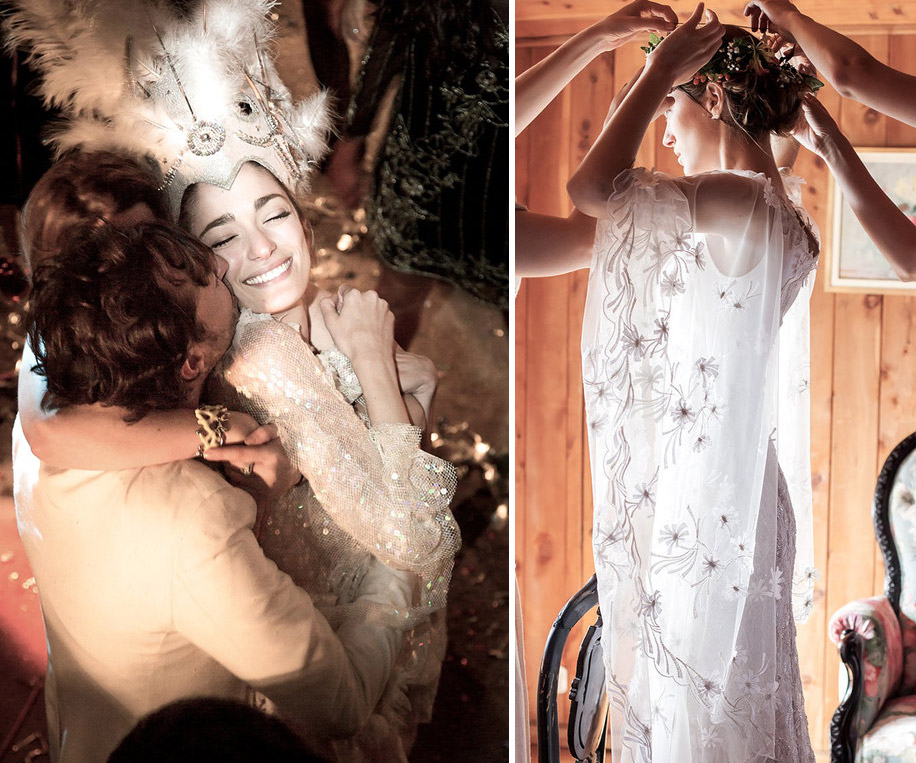 Sofia chose two different dresses by Rodarte for the evening. She wore the floor-skimming silk, tulle, and lace dress with diaphanous winglike sleeves and silver-and-cream embroidered flowers teamed with a flower crown from Maison Michel for the earlier part of the evening and then switched to a short feather-embroidered white lace–and–iridescent sequin frock for dancing until dawn to the sounds of Cumbia group Ráfaga.