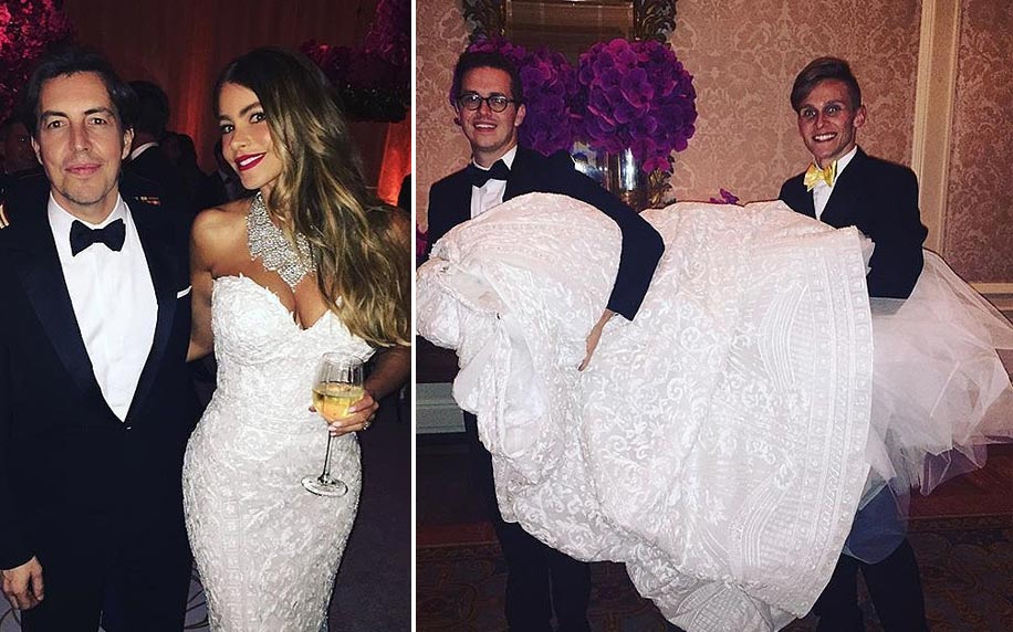 Actors Joe Manganiello and Sofia Vergara officially became husband and wife in a beautiful ceremony at The Breakers Resort, Palm Beach Florida. Sofia wore a custom Zuhair Murad Couture white strapless silk-tulle gown with a sweetheart neckline and hand-embroidered 3D embellishments on the bodice. A pearl beaded belt highlighted her waist, and a huge detachable skirt brought the drama. She finished her sparkly look with Lorraine Schwartz diamond earrings to the tune of 55 carats, plus more diamonds by the designer in her hair and on her wrist.