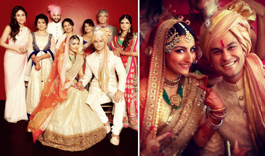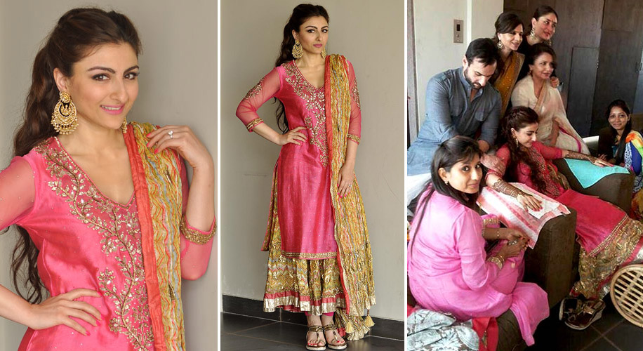 She wore a simple pink and gold ensemble with gota work from Ritu Kumar at her Mehndi ceremony and looked splendid in a gold dusted Sabyasachi lehenga teamed with an orange dupatta and a traditional passa completing her look for her pheras. Soha donned a fuchsia pink and gold lehenga in raw silk by Sanjay Garg for her reception.