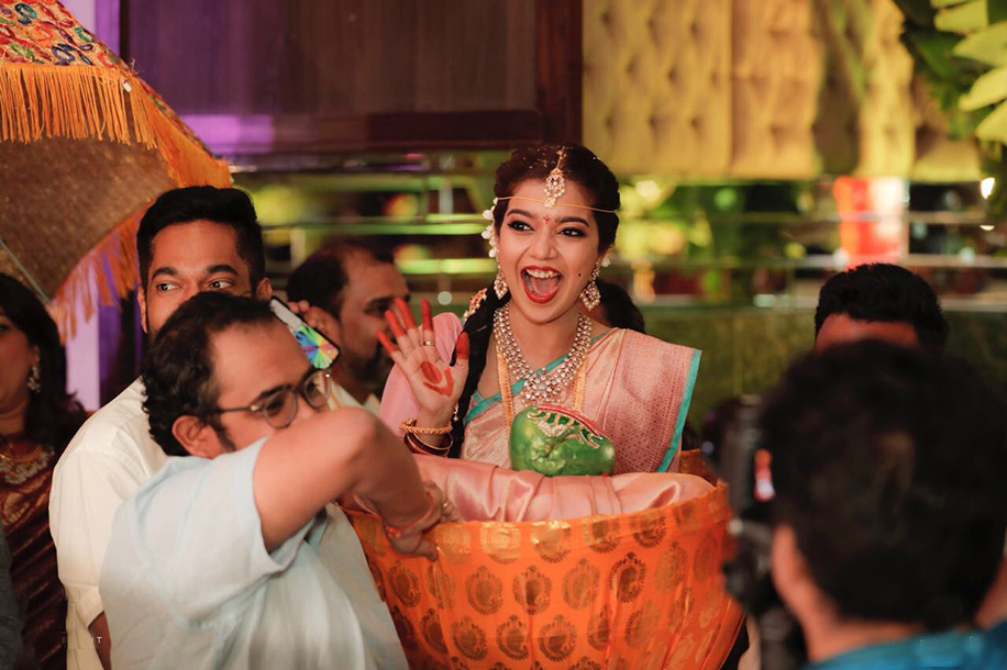 The festivities began with a haldi function for which Swathi wore a simple yellow saree that was paired with fresh floral jewellery. The following morning, the two exchanged vows in a traditional ceremony. Staying true to Telugu tradition, Swathi was a vision in her elegant Kanjeevaran silk saree paired with ethnic jewellery whereas Vikas looked every bit of a regal groom in his silk dhoti. They tied the knot in a traditional ‘Teluginti Pelli’ devoid of any filmy shenanigans. A simple affair with just family members, close relatives, and a few friends from the film industry including actor Nikhil, Chandu Mondeti and Lakshmi Manchu in attendance, the wedding ceremony was followed by a reception held at Cochin Yacht Club, Kochi.
