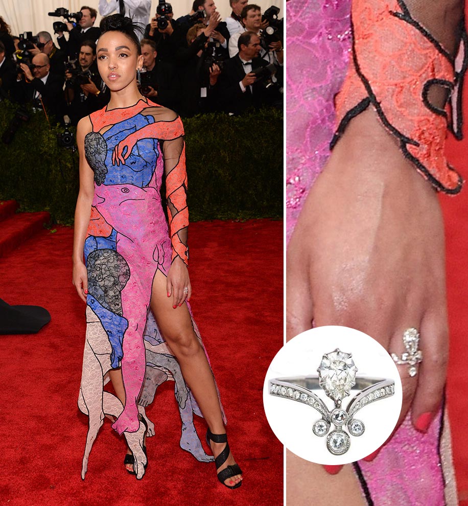 British singer FKA twigs got engaged to “Twilight” actor Robert Pattinson earlier this year. The 27-year-old proudly displayed the massive sparkler while posing on red carpet at the 2015 Met Gala and experts reckon its a highly stylized bow shaped ring featuring a pear shaped diamond of approximately 4 carats. The setting is most likely platinum, the favoured metal for art deco jewellery.