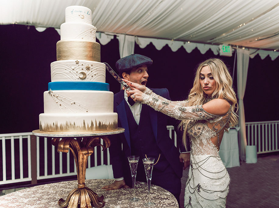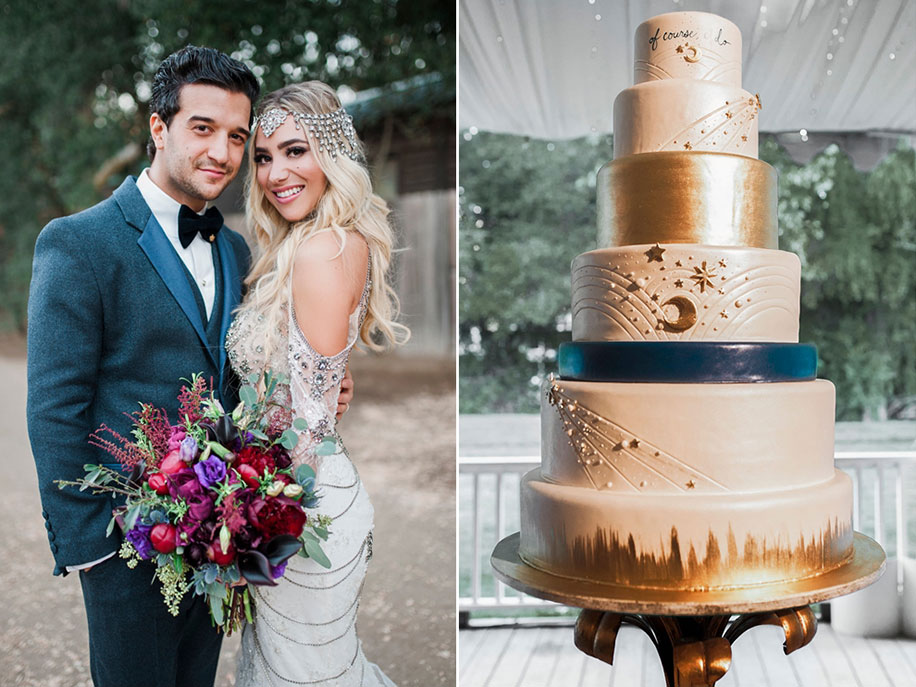 After trying 13 different cakes, the Dancing with the Stars pro and current Jersey Boys star, Mark Ballas and BC Jean ultimately chose a seven-tier cake with flavors including the baker’s signature “Pink Velvet Cake” and Neapolitan, which is made up of layers of vanilla chocolate and red velvet cake filled with layers of strawberry, vanilla and chocolate. The cakes were accented with 24-karat gold paintings crafted to look like the inside of the couple’s wedding invitations, which were custom designed. It had a navy blue touch with a gold crescent moon and stars which really looked majestic, simple and beautiful.