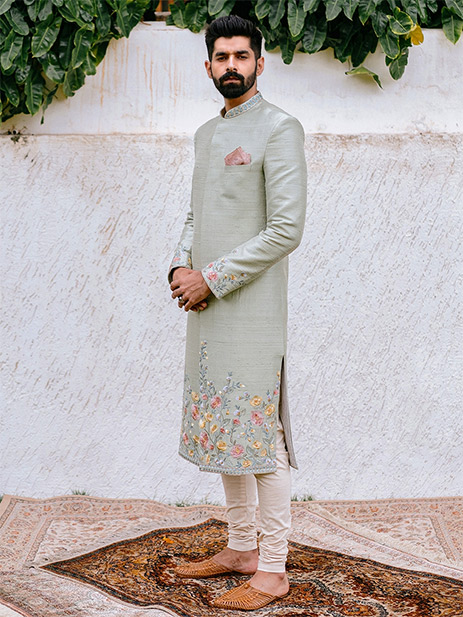 1. This icy blue Anushree Reddy sherwani with delicate floral embroidery spells springtime freshness.
