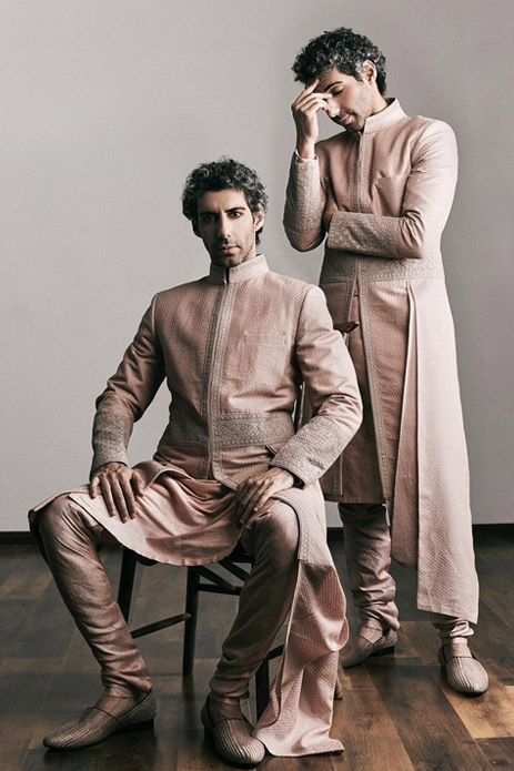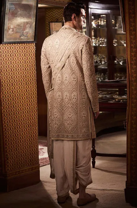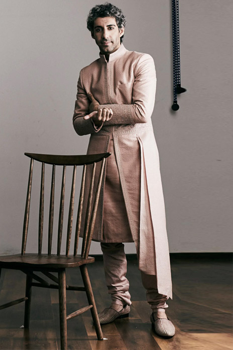 2. Nothing says eclectic elegance like this dusty rose sherwani with intricate french knots and drapes by Shantanu & Nikhil.