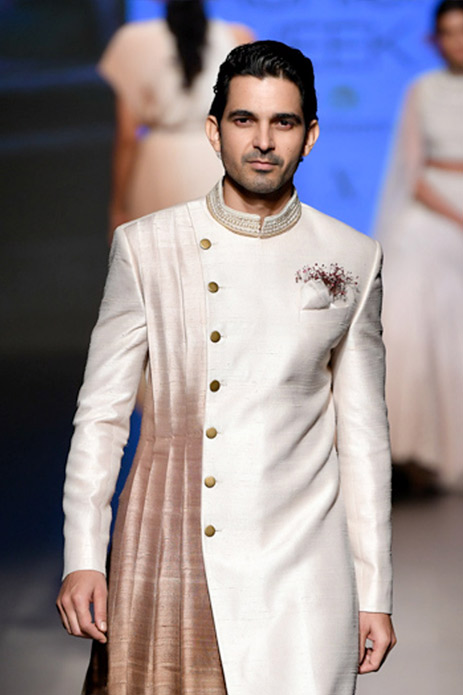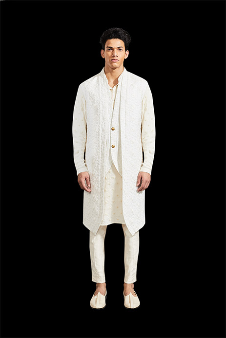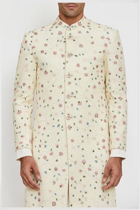 14. This Rahul Mishra ivory sherwani with pretty hand-embroidered phool jaal is the perfect blend of traditional and contemporary elements.