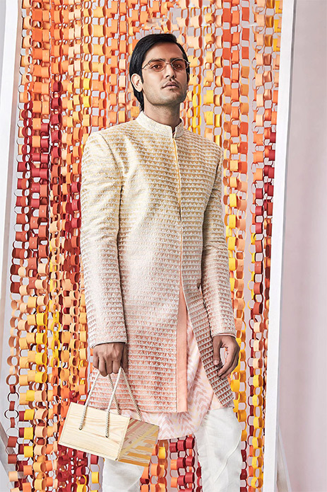 4. The stunning gold to peach ombre palette of this sherwani and kurta by Bubber Couture-Men is perfect for a day event.