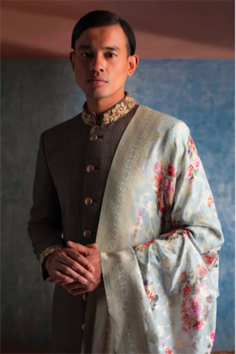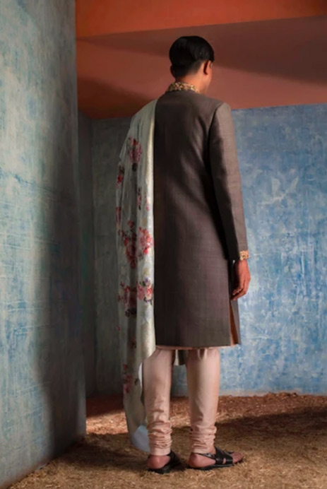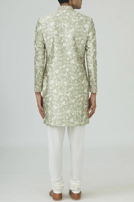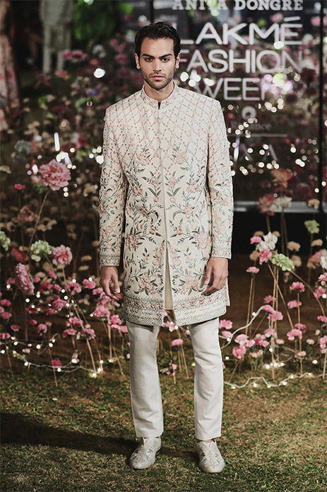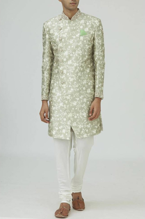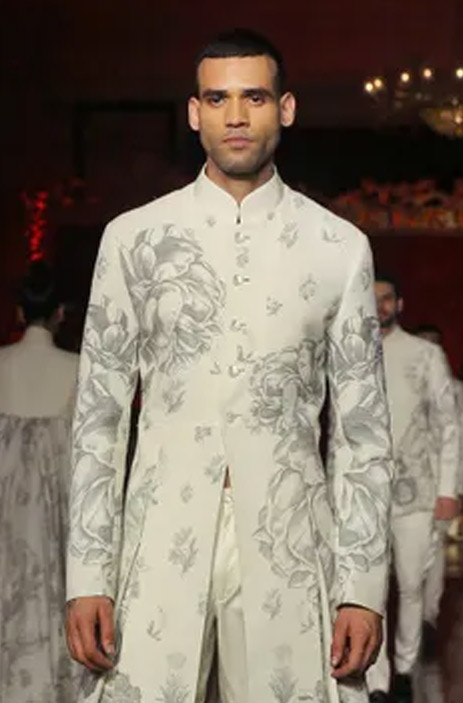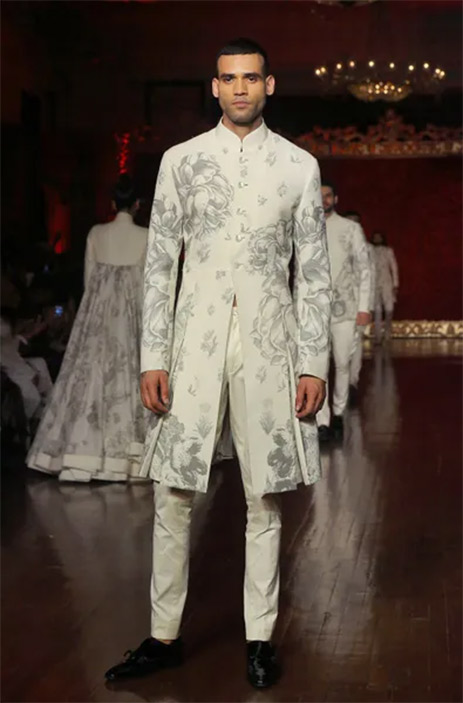 16. Make a statement in this quirky yet understated ivory sherwani with magnificent digital floral prints by Rohit Bal.