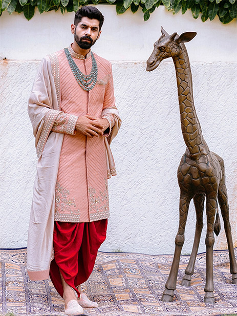 6. The floral zardozi, subtle threadwork and pearl highlights on this peach silk sherwani and red dhoti ensemble by Anushree Reddy is just what’s needed for a regal and intimate soiree.