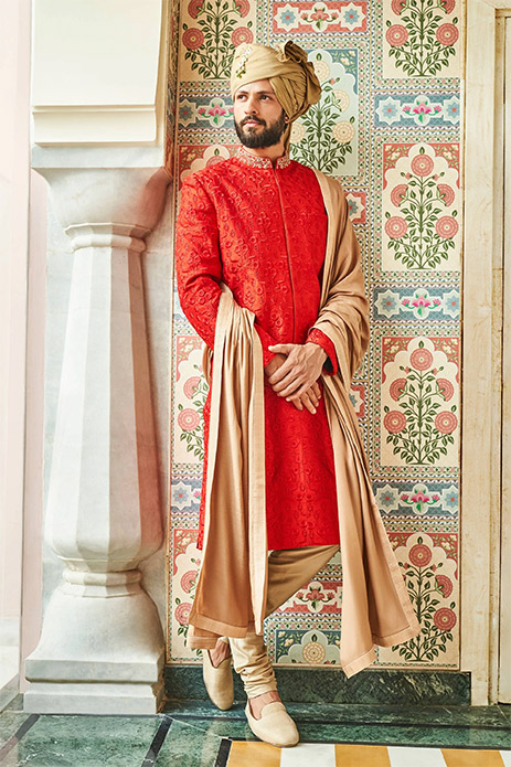 10. Turn heads in this vibrant red Anita Dongre silk sherwani that features elegant gold zardozi and a softly draped stole with a matching turban.