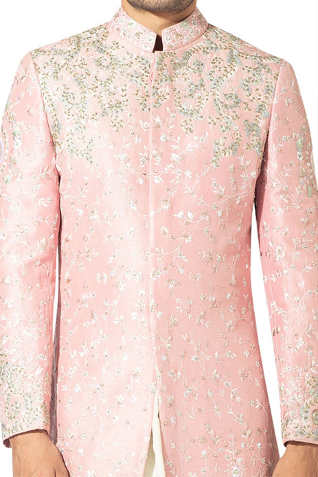 12. Perfect for a day event, this ethereal blush sherwani by Varun Bahl features overall jaal embroidery.