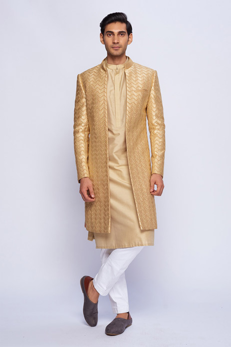 13. The golden gleam of this chevron print sherwani by Tisa Men is perfect for a dazzling sangeet or an ethnic reception.