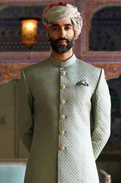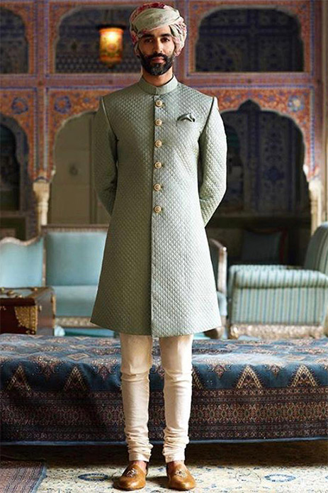 18. Embrace the cool tones of this jade quilted silk sherwani by Sabyasachi Mukherjee for a refined day wedding.