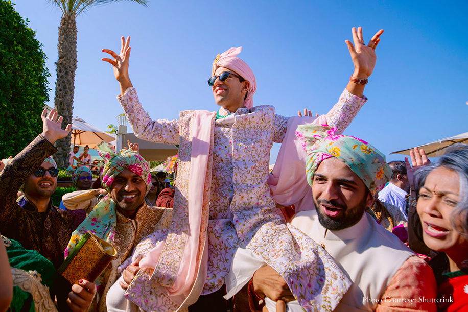 20. A high-spirited Ronak looked radiant in the spring hues of his delicately patterned floral sherwani as he ruled the baraat.
