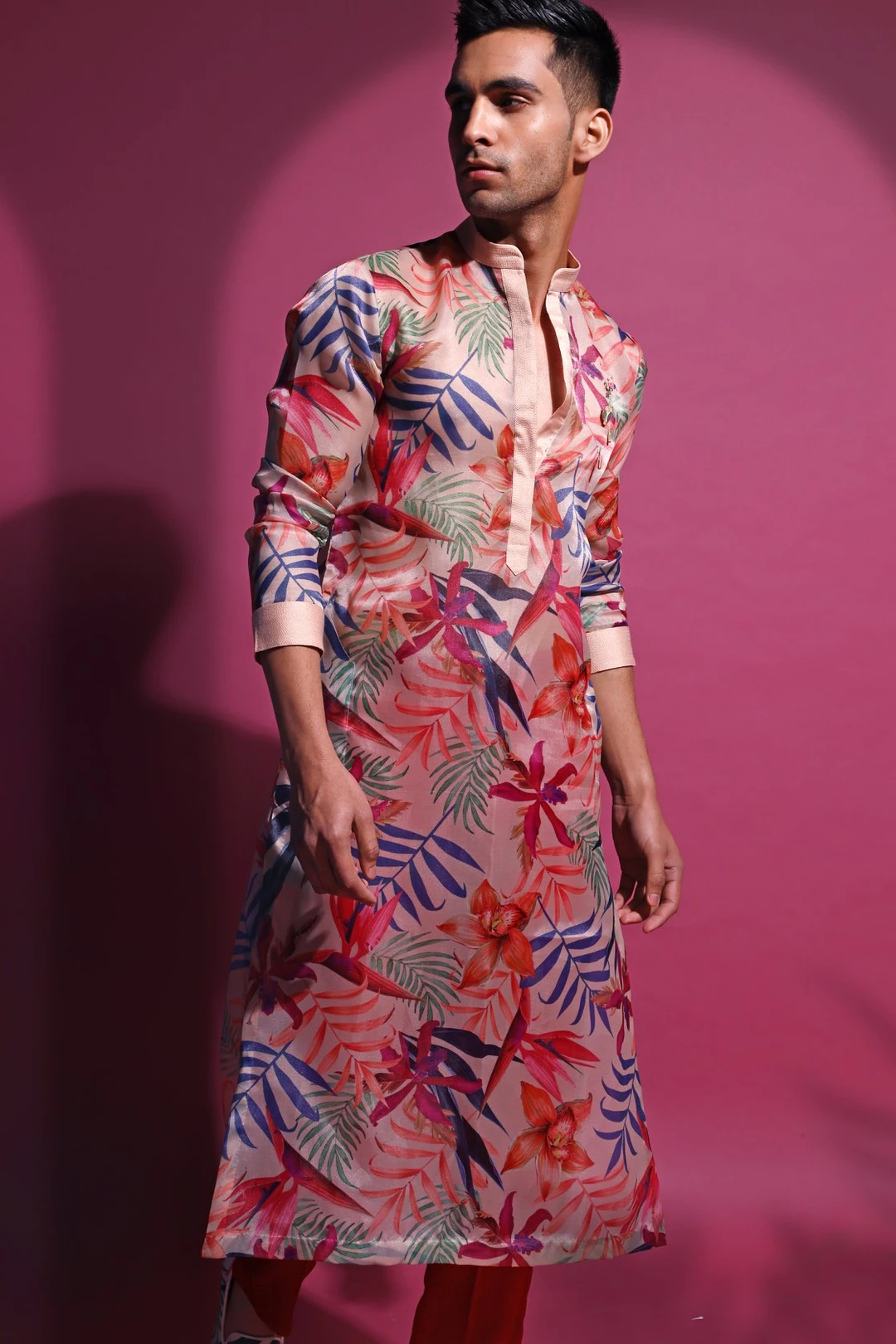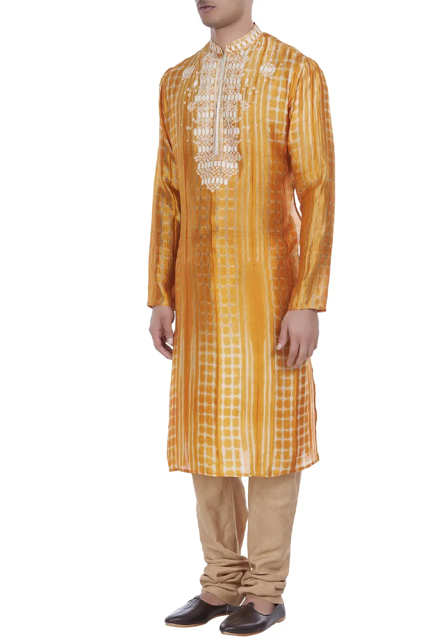 Krishna Mehta’s rich silk kurtas in decadent, bright colors effortlessly blend style and comfort, perfect for a Mehndi.