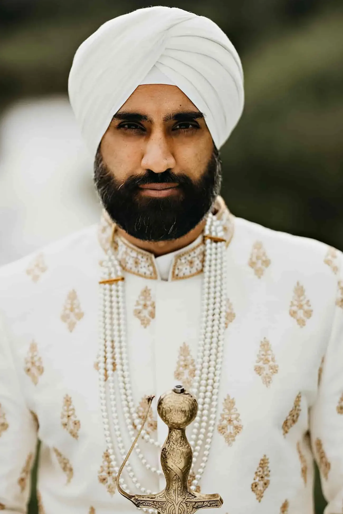 A lightly embroidered white sherwani accessorized with luxurious pearls and a delicate peach turban is perfect for a desi fairytale wedding.