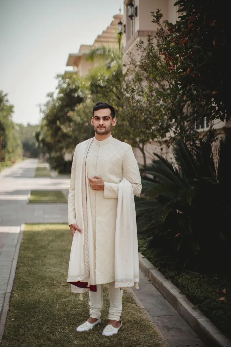 Simple yet sophisticated, this ivory sherwani with a silver-bordered dupatta is perfect for the minimalistic man who wants to keep fuss to the minimum.