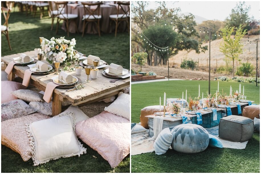 Planning a super relaxed brunch? How about a picnic style meal served on long low tables with plush cushions for comfort! Add some golden candelabras and vibrant floral arrangements to the mix, and you’ll have an Insta-worthy set up that will get everyone clicking!