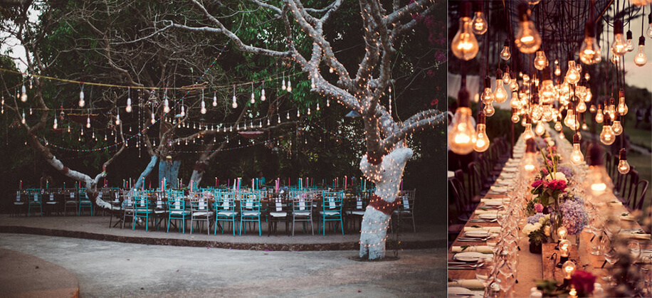 Warm yellow lights can transform even the coldest spaces into inviting settings. Think fairy lights draped over trees, bistro lights hanging from above, clusters of paper lanterns in charming corners or just good old candles dotting the venue. They can be placed in every which way to fit your personal preferences.