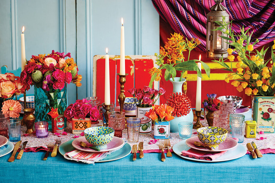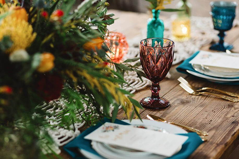 For a gypsy-like vibe at your wedding, steer clear of tableware in subdued, tonal colors and make your events a bohemian feast using colorful crockery and glassware. Opt for vintage glasses and plates and forget fussing over matching all the pieces. Here, it’s the lack of uniformity that is going to elevate the aesthetics.