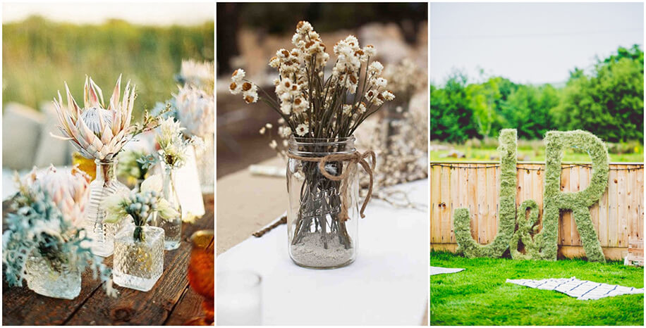 Elements borrowed from nature are essential for boho celebrations. Floral arrangements that look perfectly imperfect as if they were just picked and bunched together in a collection of bottles in different shapes and sizes are wonderful. Succulents in small terracotta pots and initials covered with moss and ferns make for great additions to the mix.