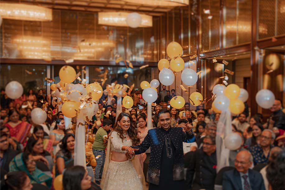 6. Raghavi and Prithvi showcased their love for the Potter series with a giant floor-to-ceiling chamber of secrets book entrance, wall-to-wall bookcase photo booth, and speciality Harry Potter-themed cocktails. With the bartenders wearing sorting hats, a giant multi-panelled LED screen to act as a backdrop to Hogwarts and transform into speciality LED lighting effects during the afterparty, and lots and lots of candles as part of the table settings – this reception was certainly not a muggle celebration!
