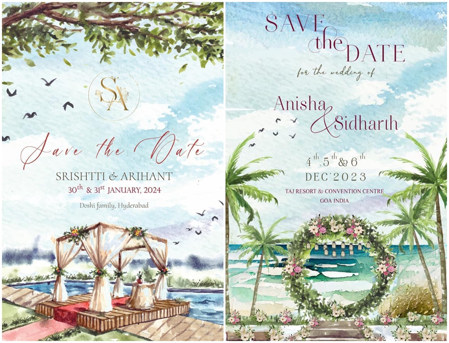 Coastal beauty meets traditional charm – this watercolor Save the Date by Megha Beria Designs perfectly illustrates the breezy allure of a Goa destination wedding!