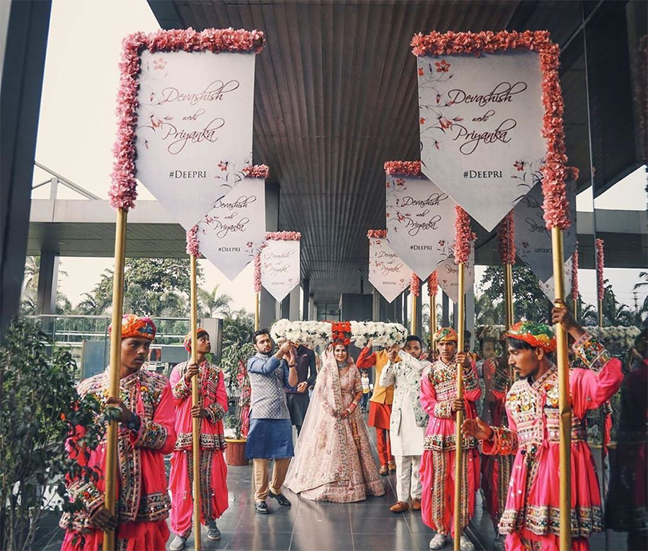 Make a statement with a royal entry flanked by flag bearers carrying personalized banners.