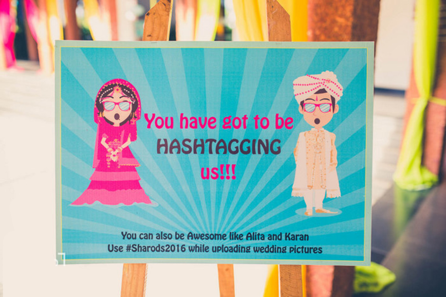 Be it a cozy intimate affair or the very definition of the big fat Indian wedding, every couple wants their wedding to stand out, and speak of who they are. While décor, outfits and festivities surely capture your personality, another fun way to make your nuptials memorable are wedding hashtags! All the rage in recent times, hashtags have seen a plethora of creativity ranging from abbreviated names to witty puns. However, once you have your hashtag in place, there are innumerable ways to incorporate it into your wedding. From backdrop displays and photo ops to accessories, outfits, props and even edibles, the choices are endless!