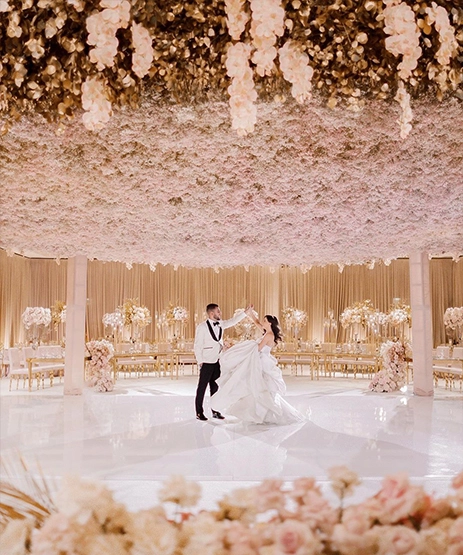 This captivating champagne and blush canopy of flowers and tinsel hands seems like a dreamy floating cloud atop the gleaming dance floor.