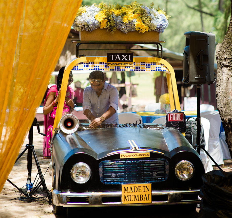 Get that ‘Mumbai Bazaar’ feel when you bring in the iconic kaali-peeli taxi as a prop. Best thing? The taxi goes beautifully with the Indian wedding favorite flower, the marigold. Heap them in baskets and let your friends in for the ride of their lives, going nowhere but into their favorite memories.