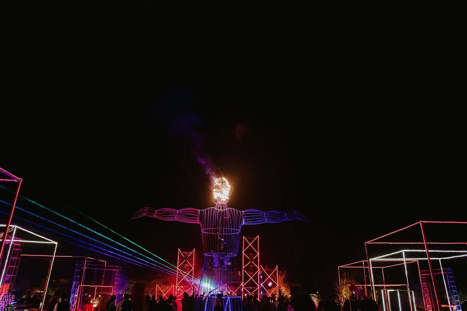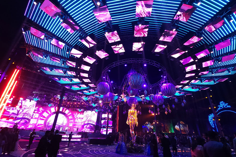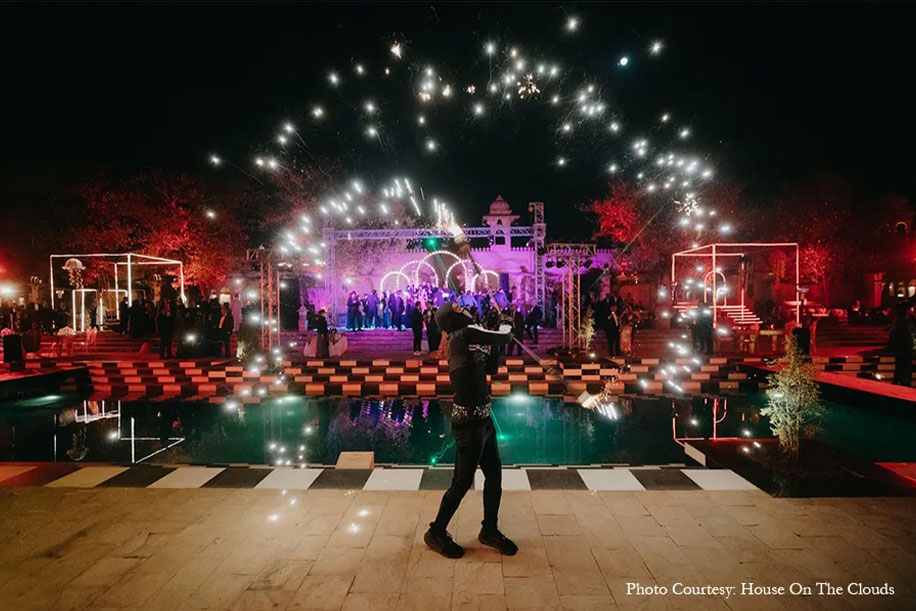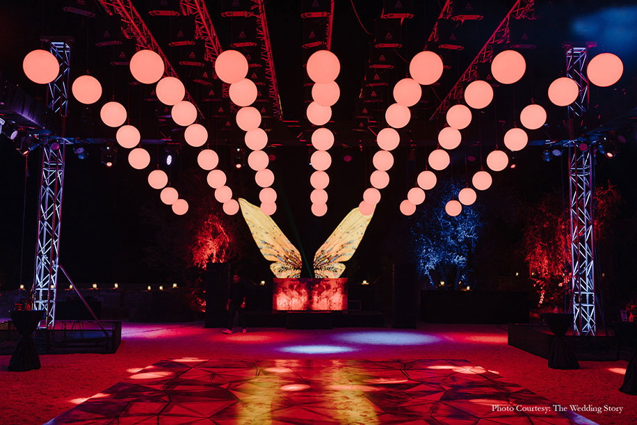 8. A Techno-Ethereal Universe came alive at this Tomorrowland-inspired cocktail setup, offering a magnificent sensorial experience with cutting-edge technology. Designed by WeddingSutra Favorite Taxi Design Studio, the event featured celebrity performances, aerial acts, and a stellar light show, offering the guests truly an otherworldly experience.