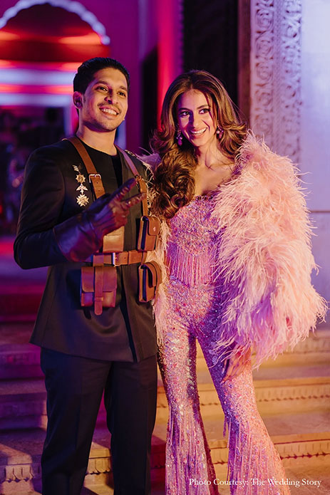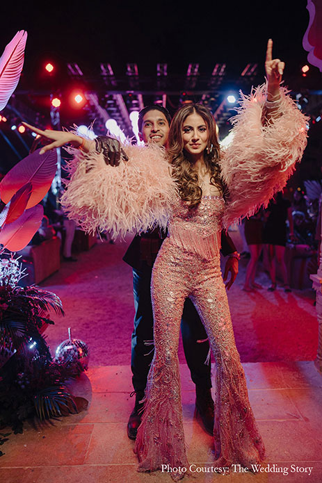 3. Rhea and Divish’s ‘Music Fest’ themed brunch party welcomed the wedding brigade stylishly into the celebration! Hosted at Udaivilas Udaipur, Rajasthan, this one of its kind avante garde luncheon brought the “Burning Man” experience to life. The Cocktail night was Inspired by Amsterdam’s red light district with its EDM music scene and neon lights.