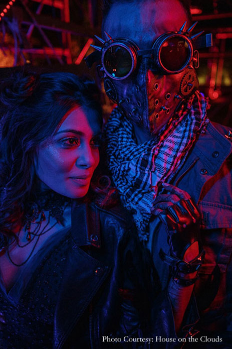 2. Mansi and Samuel hosted a cocktail night no less than Burning Man in Thar desert! Planned by WeddingSutra Favorite – Kkings Events in Suryagarh, Jaisalmer, the desert was the perfect backdrop for their steampunk-themed affair complete with fire sculptures, gas masks and goggles and wild fashion choices.