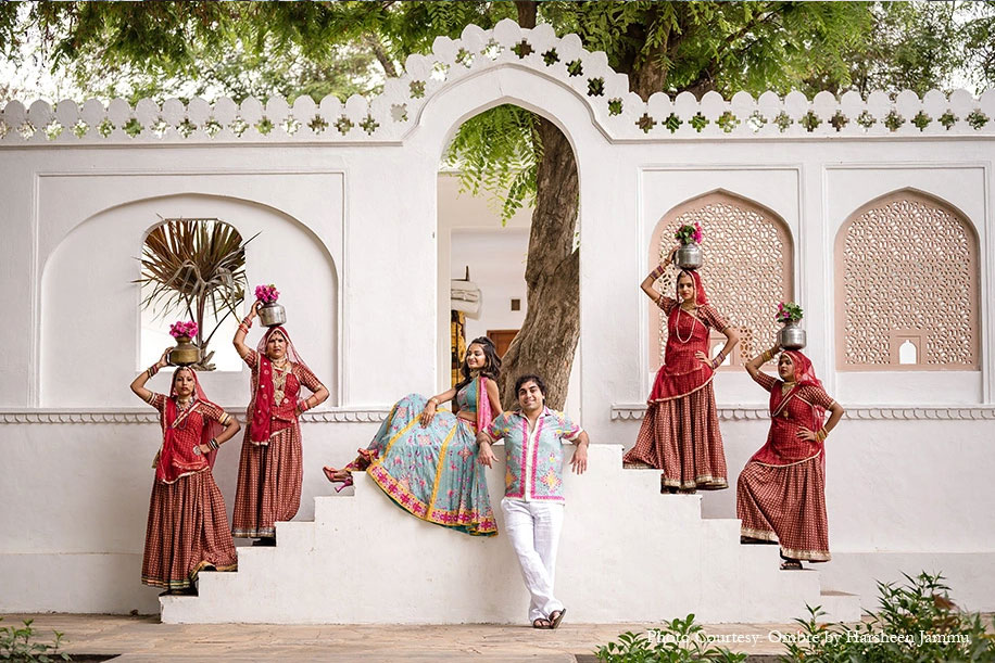 6. Shurti and Shayaun’s Mehndi combined a music festival vibe with a desi mela, blending traditional tunes with EDM. Planned and decorated by WeddingSutra Favorite – TailorMade Experiences at Samode Palace, the event featured color cannons, music and dancing, camel rides, and kite flying!