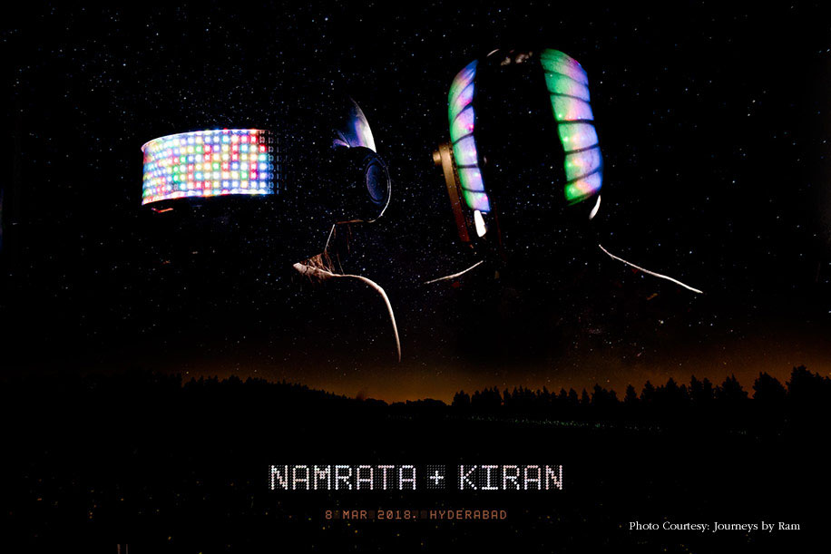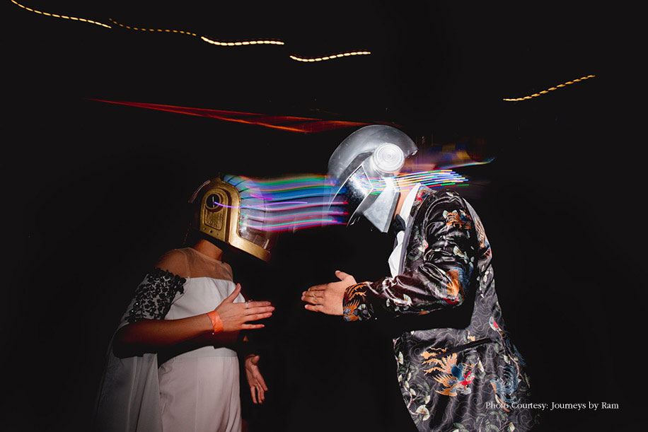 7. Kiran and Namrata 3D printed, programmed, and engineered their favorite duo – Daft Punk’s iconic helmets for their cocktail party. These were complete with LED matrix animations, sound, and Bluetooth reactive sensors, alongside Mario and Pacman animations. They wore the helmets and did a small dance tribute to ‘Technologic,’ ‘Get Lucky’, and ‘One More Time.’