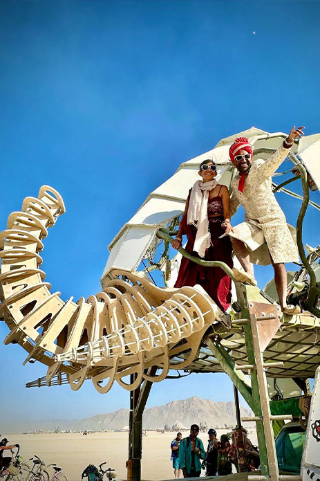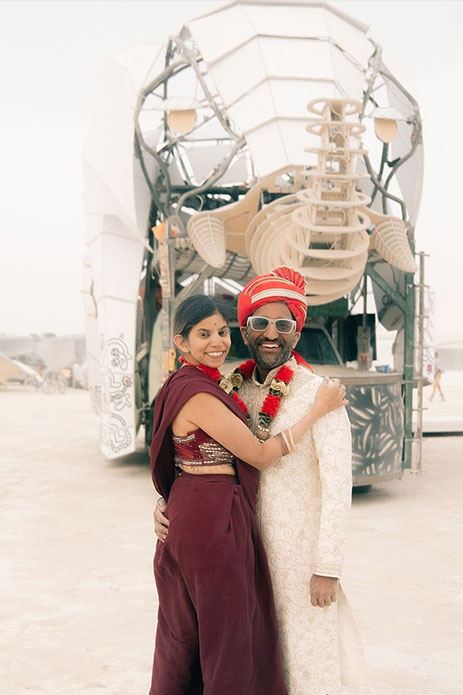 5. Sheel and Amruta’s wedding at Burning Man featured a mechanical elephant and Bollywood fusion! The couple’s artist friends built a monumental elephant-shaped art structure on a functioning vehicle with a moving trunk playing desi music for their baraat. And when the winds picked up and turned into a dust storm, the baraatis said why not! Carpe Diem!