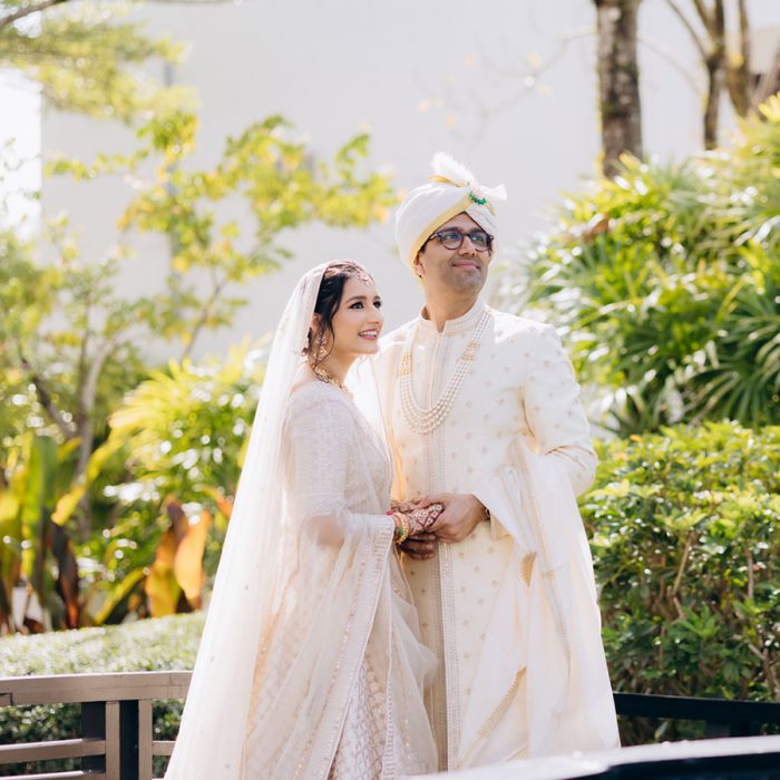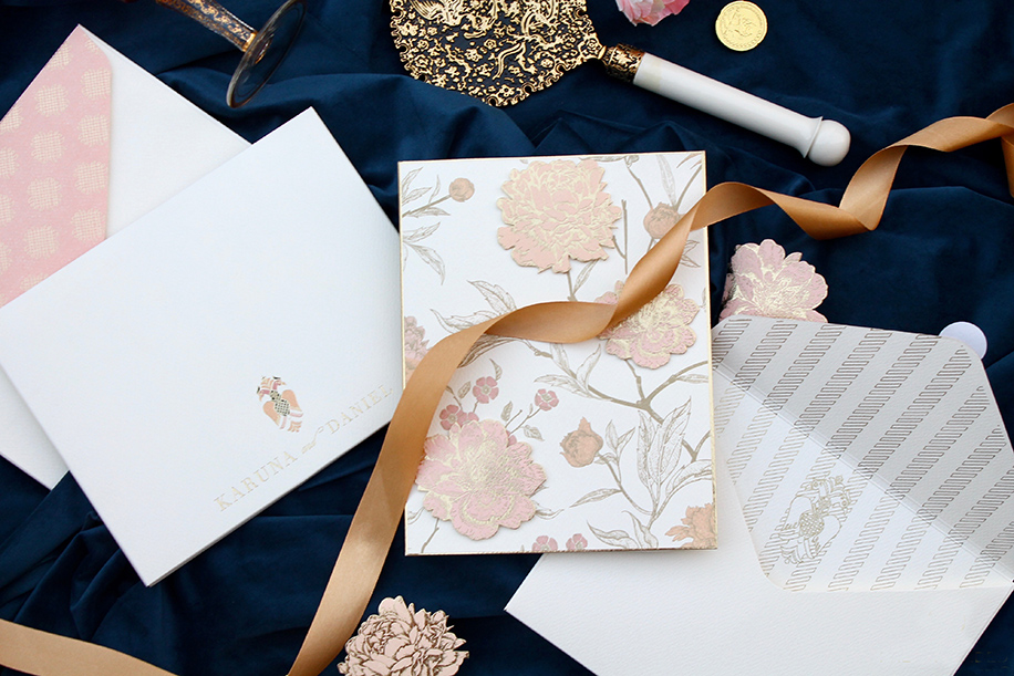 Pretty Gilded Design created this contemporary invitation in an ivory and gold palette with fresh hues of blush and peach. A fusion of South-Indian motifs, contemporary florals and a modern layout beautifully depicts the couple’s cross-cultural wedding.