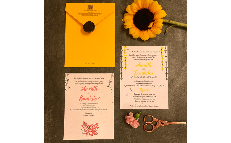 There’s nothing like a splash of yellow to add color to your wedding. Brownie points to Pink Whistle Man for creating this invitation using seed paper, assuring you that all the handmade cards can be used for a greater cause.