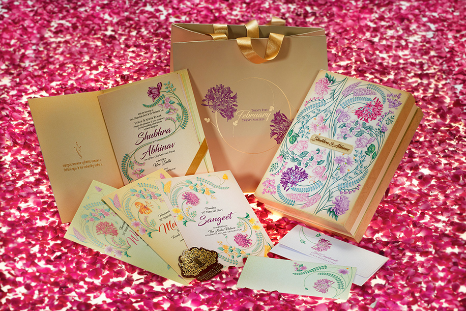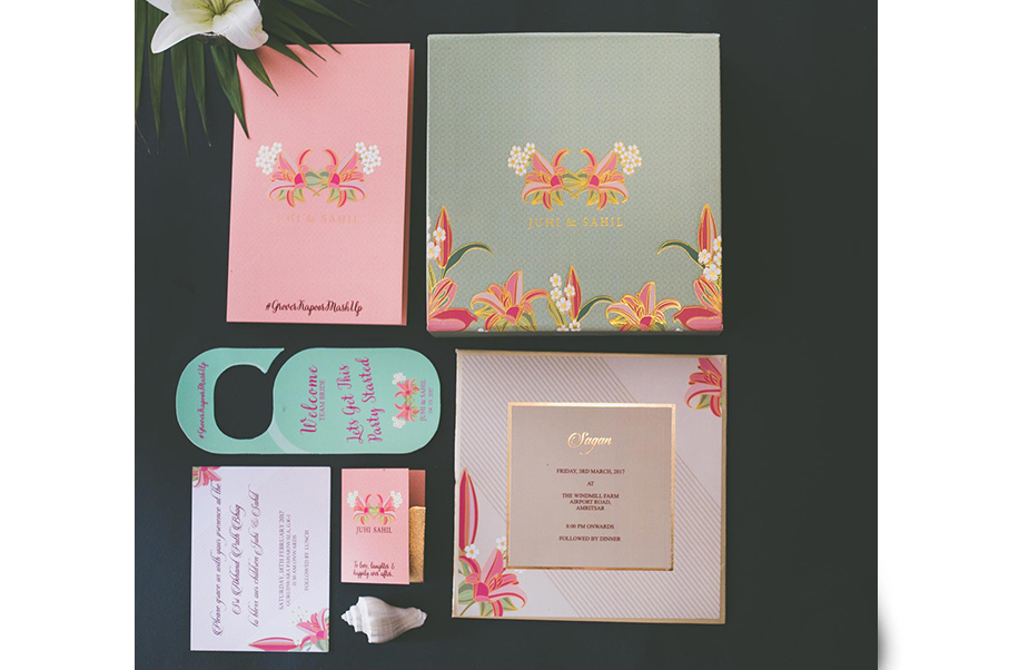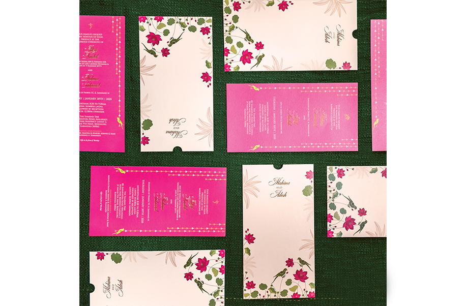 This invitation card by Radhika Pitti Studio is a breath of fresh air. It has been designed on a bright pink base and is enclosed in a beautiful floral envelope that depicts parrots perched in a garden.