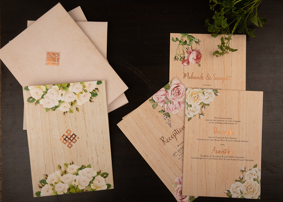Shreyansh Bespoke added some rustic charm by creating a faux wood texture on paper as the base. Beautiful bouquets of pastel-colored roses added some cool vibes to these invitations.