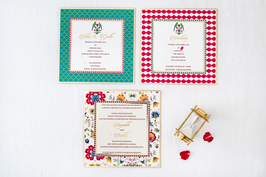 From Mughal jaalis to a vibrant splash of chintz flowers, Be Jalebi used bright colors and patterns in a palette of teal, red and yellow on a white base to create a one-of-a-kind invitation.
