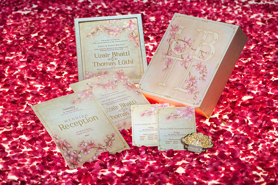 Spell-binding and enchanting, this gold and pink invitation by Izhaar by Core Designs with a glittering gold-embossed design on the lid of the box exudes elegance and class.