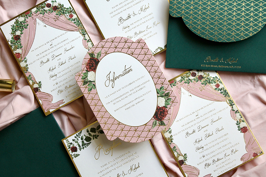 This Secret Garden-themed wedding invitation with fresh florals and a touch of a traditional Indian jaali pattern is the artistic work of Pretty Gilded Design. Emerald green, blush pink, serene white, glittering gold and hints of burgundy form the perfect color palette for this masterpiece.