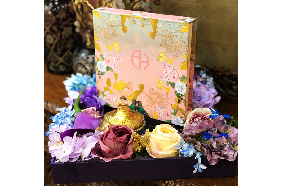 Make your guests experience sheer opulence with one of the most stunning setups of a luxurious invitation hamper by Puneet Gupta Invitations with a bed of faux floral garden and a beautiful hand-painted print on the invitation box that went along with handcrafted 24K gold foil work bowl.