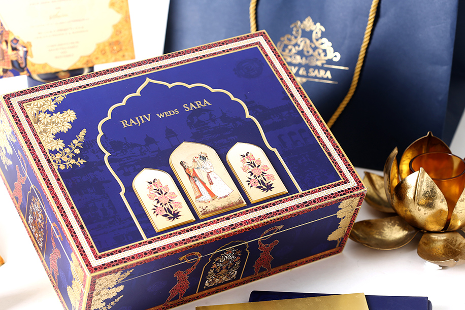 A rich blue backdrop with ethnic motifs created an invitation perfect for a palatial wedding. Made by Gold Leaf Designs, this invitation was presented in a sophisticated chest with elements reminiscent of the Indo-Saracenic architecture found in palaces.
