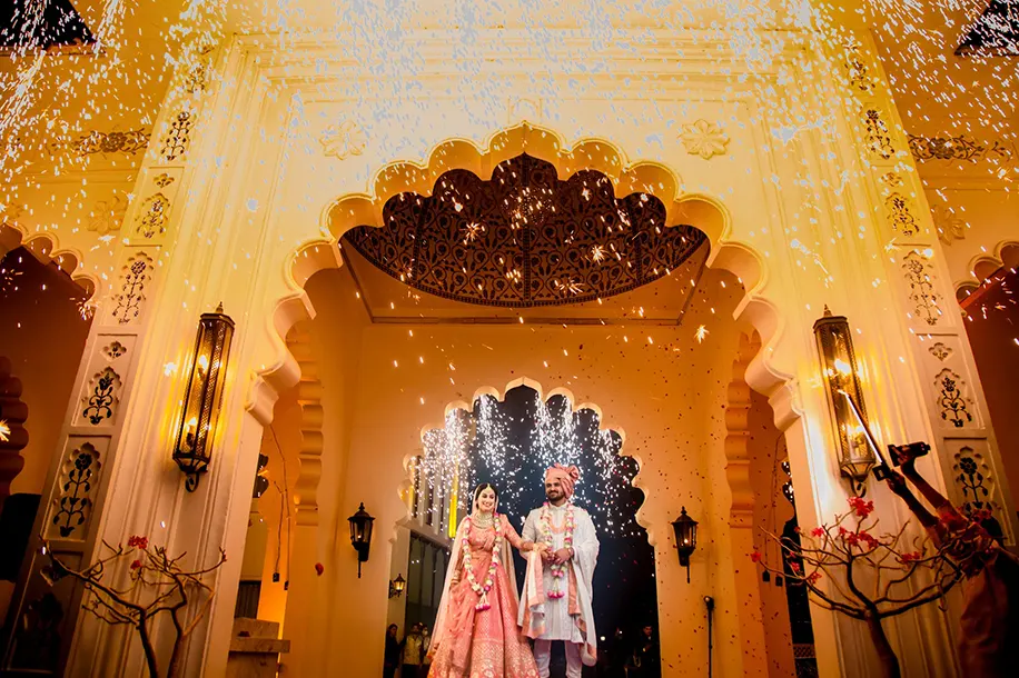 Kashish and Yash’s glamorous wedding at Taj Aravali Resort & Spa, Udaipur.