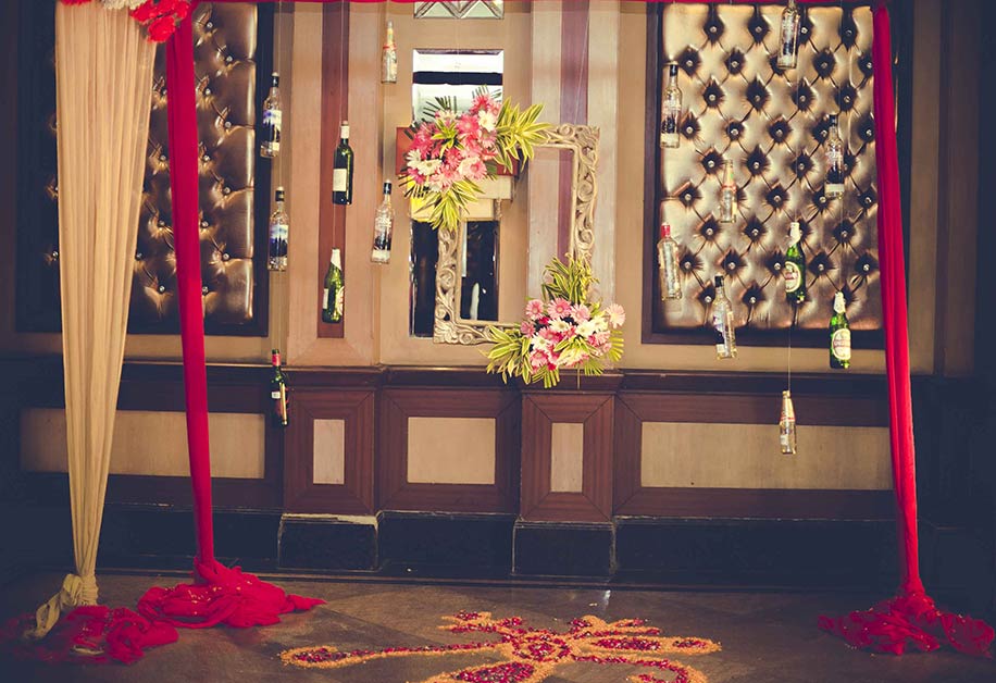 To up the engagement swag game, the photo booth at the engagement was crafted out of repurposed Smirnoff vodka, beer, and wine bottles. Using empty suspended bottle decor with some florals is a creative method to make your event unique and quirky. For those who will be dancing on the beats of ‘Kala Chashma’ at your friends’ weddings this season, here’s how Aanchal and Shray nailed it along with their guests.