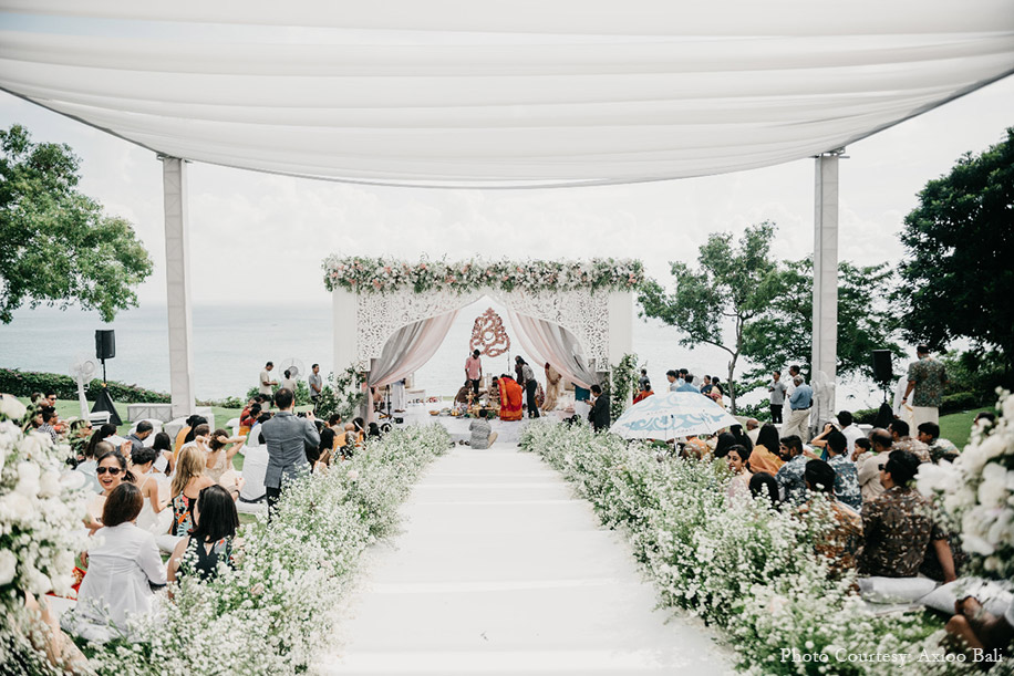 This minimal mandap looks elegant and enchanting. Prominent pink and lavender flowers like roses alongside lush fronds and ferns cover the pillars of the mandap in a twisting design. The bare canopy offers a stark contrast to the floral arrangements, thus making this mandap an eye-catching highlight of this outdoor wedding with the monotone grey sea in the backdrop.