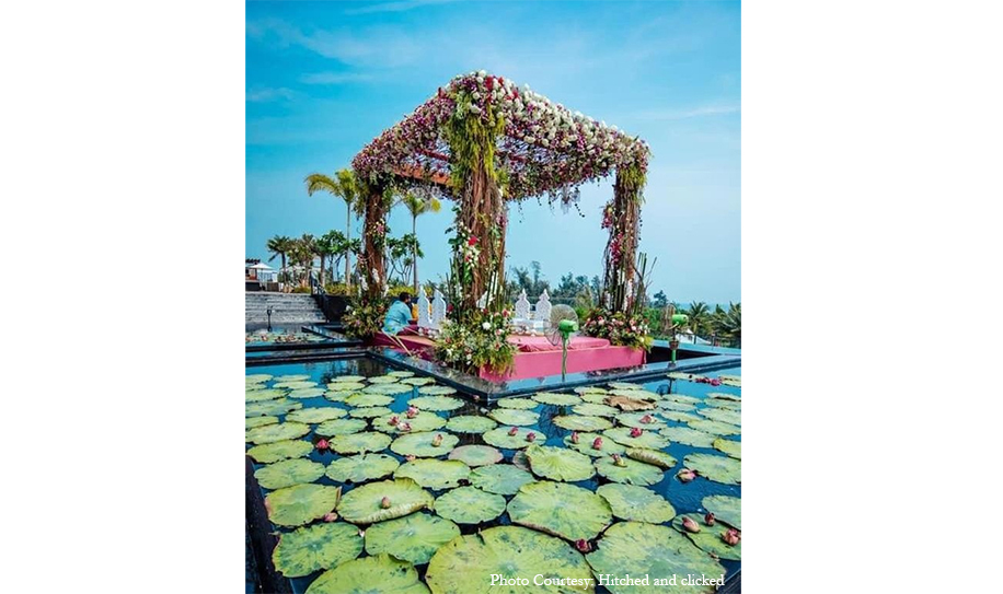 Exuding the feel of a tropical rainforest, this mandap has pillars covered with dense foliage, twigs, and flowers. The appearance of lotus pads floating on the waters below the structure just adds to the overall lush vibe of the structure where it seems nature is in harmony with the design.