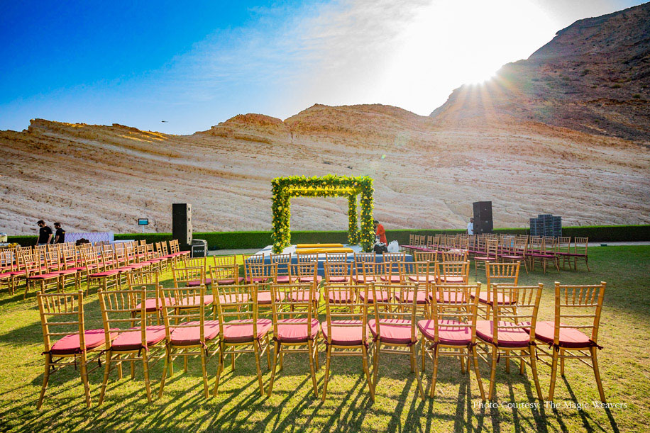 Yellow, light orange and green form the trio of colors used in this minimalist mandap that is lit by the sun’s rays. The stark background of Oman’s brown mountains that face the pheras venue offers a compelling contrast to this verdant, vibrant mandap.